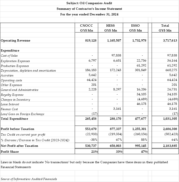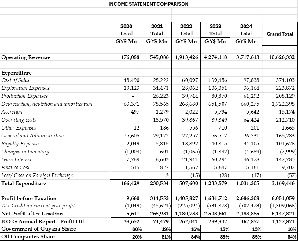 Since the Government pays the corporate tax of all the companies from its share of profit oil, there should is no differential treatment. Yet, the effective tax rate of tax on the income earned by each of the companies differs significantly. This is not helped by three divergent disclosure notes, the reason for which is far from apparent. Even more troubling is the illusion of equity embedded in the so-called 50/50 profit-sharing arrangement. The financial statements of the oil companies show multibillion-dollar earnings while Guyana’s share remains comparatively meagre. The ratio for the year 2024 and cumulatively for the five years to December 2024 is in excess of 5:1.