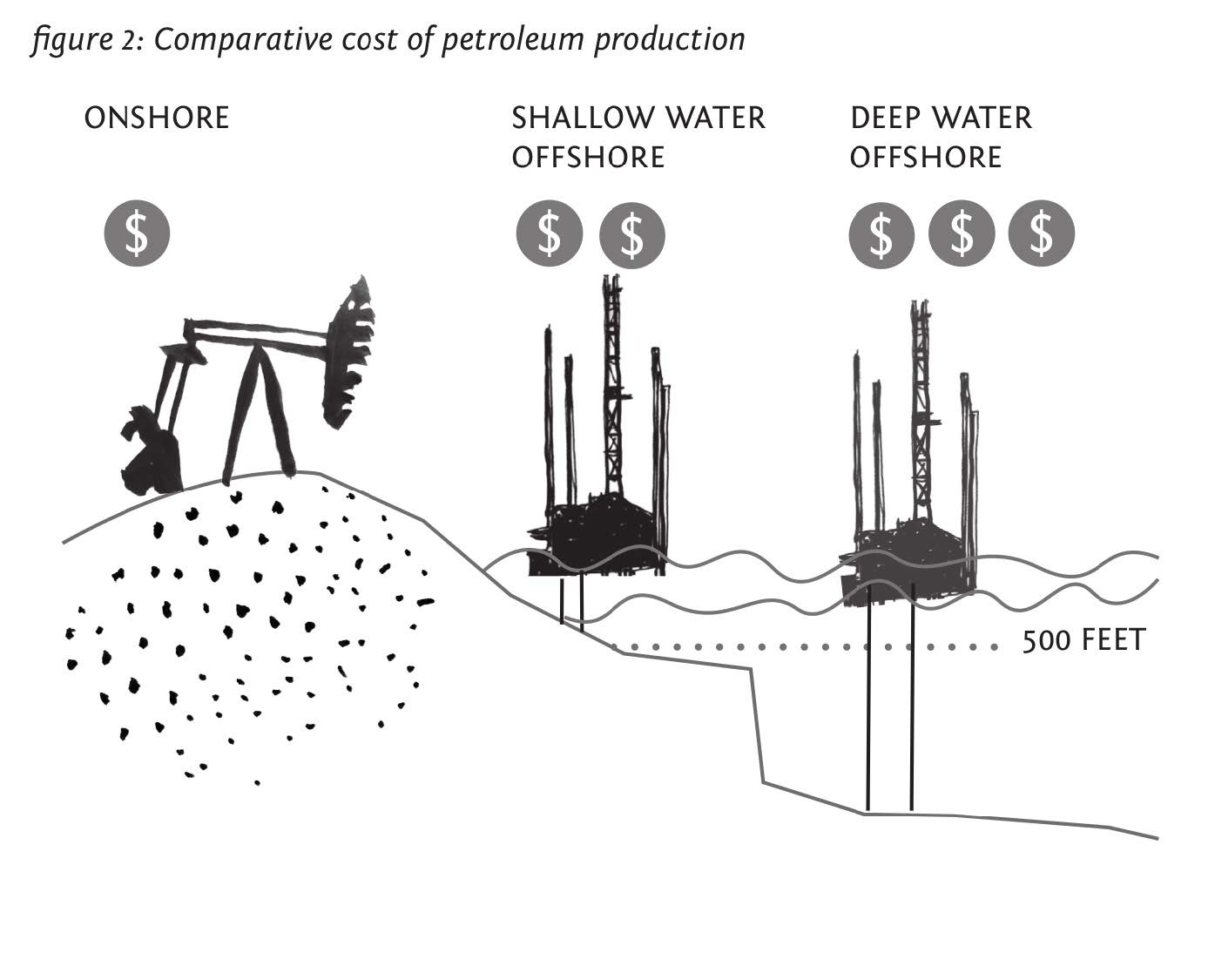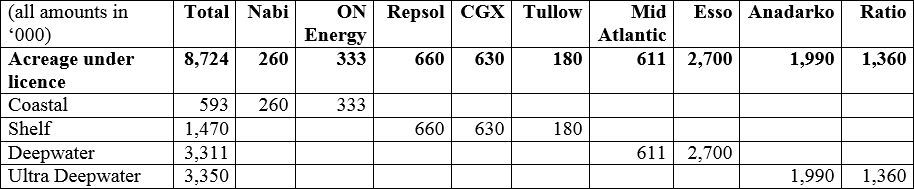 Another interesting and perhaps not unrelated feature of the licences is that 6,661,000 hectares or 76% is located in deepwater or ultra deepwater. The Geology and Mines Commission defines deepwater as anything between 300 metres to 1,000 metres and ultra deepwater as any depth over 1,000 metres. While the technology has come a long way since oil exploration moved from land to water in the late nineteenth and early twentieth century, confronting and managing the challenges of deepwater drilling are neither uniform nor cheap. Apart from, or perhaps attendant with, the technological challenges of deepwater exploration and production are huge risks and high costs.